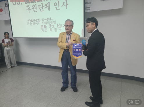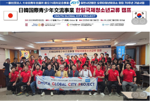 일본 후쿠오카 오무타 청년회의소 이사장에게, 오무타청년회의소 창립 70주년기념사업으로 <일한국제청소년교류캠프>를 한국 서울에서 개최함에 대한 감사의 마음을 담아 <감사패> 와 기념 <페넌트>를 전달했다