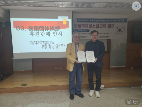 ■이번 국제청소년교류행사를 총괄한 <이데 유키에> 한일친선위원장과 장소 섭외를 담당한 <권용순> 자문위원에게 감사드립니다 🙏