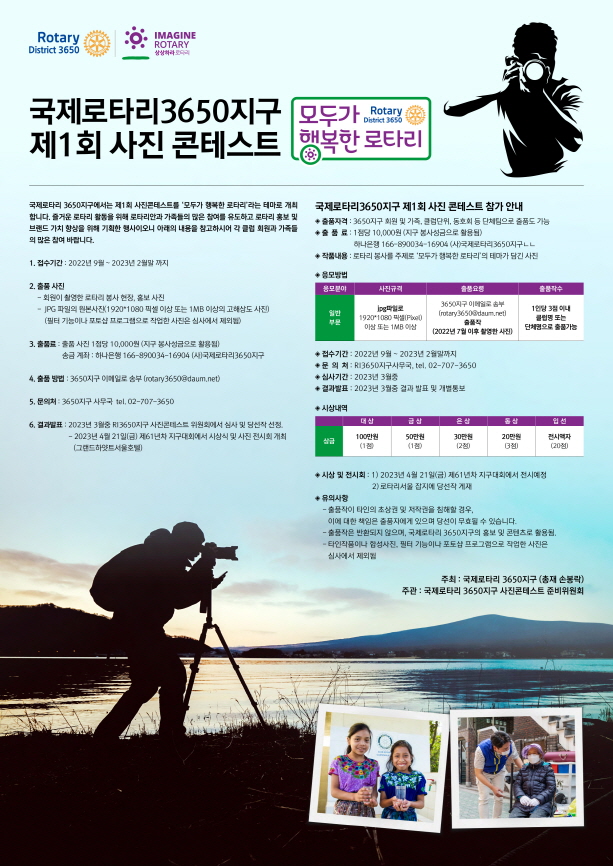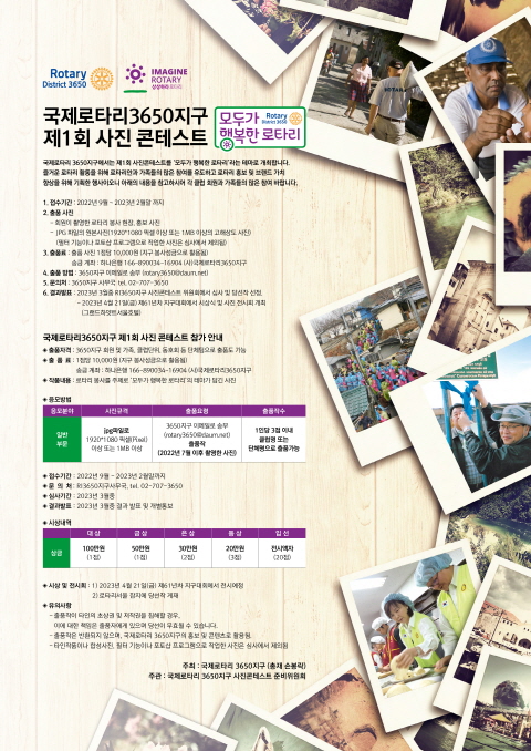 2. 국제로타리 3650지구에서는 제1회 사진콘테스트를 ‘모두가 행복한 로타리’라는 테마로 개최합니다.