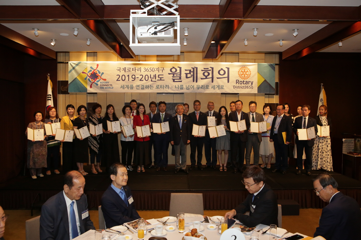 이번 월례회의에서는 서울새노원, 한양, 서울코암, 서울, 서울무악, 서울중앙, 새서울, 서울용산, 서울아미, 서울예장, 서울파고다, 서울C&C 로타리클럽 등 12개 클럽, 신입회원 30명이 참석하여 신입회원 인정서를 박수부 총재가 전달했고, 역대 총재단이 로타리뱃지를 직접 달아주며 성대한 환영식을 가졌다.