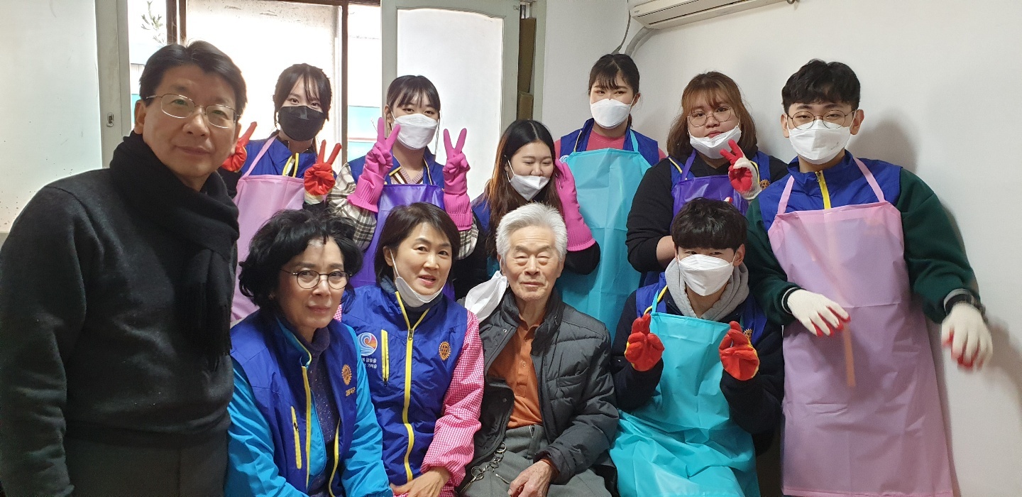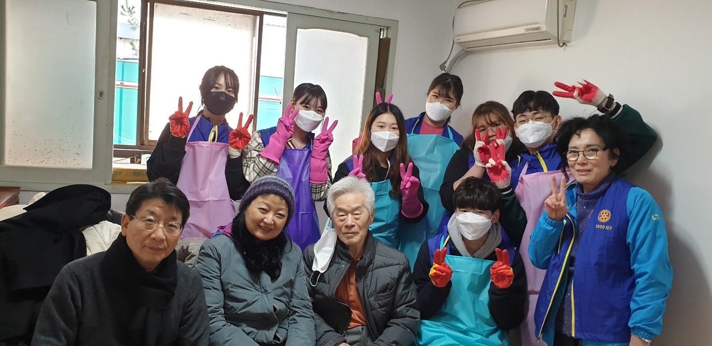 매번 봉사할 때마다 느끼는 것이지만 현장봉사에는 설레임이 있다. 고무장갑, 수세미, 프랭카드, 봉사조끼 등 준비물들을 빠짐없이 챙기고 처음 가는 동네들도 있어 늦을까봐 밤새 선잠을 자고 일어나 현장으로 출동을 한다. 주소를 확인하고 아파트하고는 다른 골목골목에 있는 가게들을 지나 ‘세탁소건너 파란대문집’이거나 ‘신발가게 지나 철물점지하 일층’ 이라고 한 때론 찾기 어려운 집들을 찾아서 드디어 현장에 도착하면 비로소 안심이다. 입구부터 왁자한 소리와 함께 좁은 현관에 학생운동화가 발디딜틈 없이 꽉 차게 있고 벌써 8시부터 와있었다는 로타랙트들로 조그만 집이 북적북적하였다. 추운날씨에 부지런히 일찍부터 봉사하러 와 있는 학생들을 보니 대견한 마음에 모두 모두 이쁘고 잘생겨 보인다. 작년에는 스케쥴이 안 맞아 로타랙트가 한 명도 올 수 없어 정말 힘들었던 것을 생각하면 이렇게 학생들이 다른 것 다 제치고 한 명 한 명이 집수리를 위해 온 것이 정말 감사하고 기쁜 일이 아닐 수 없다.