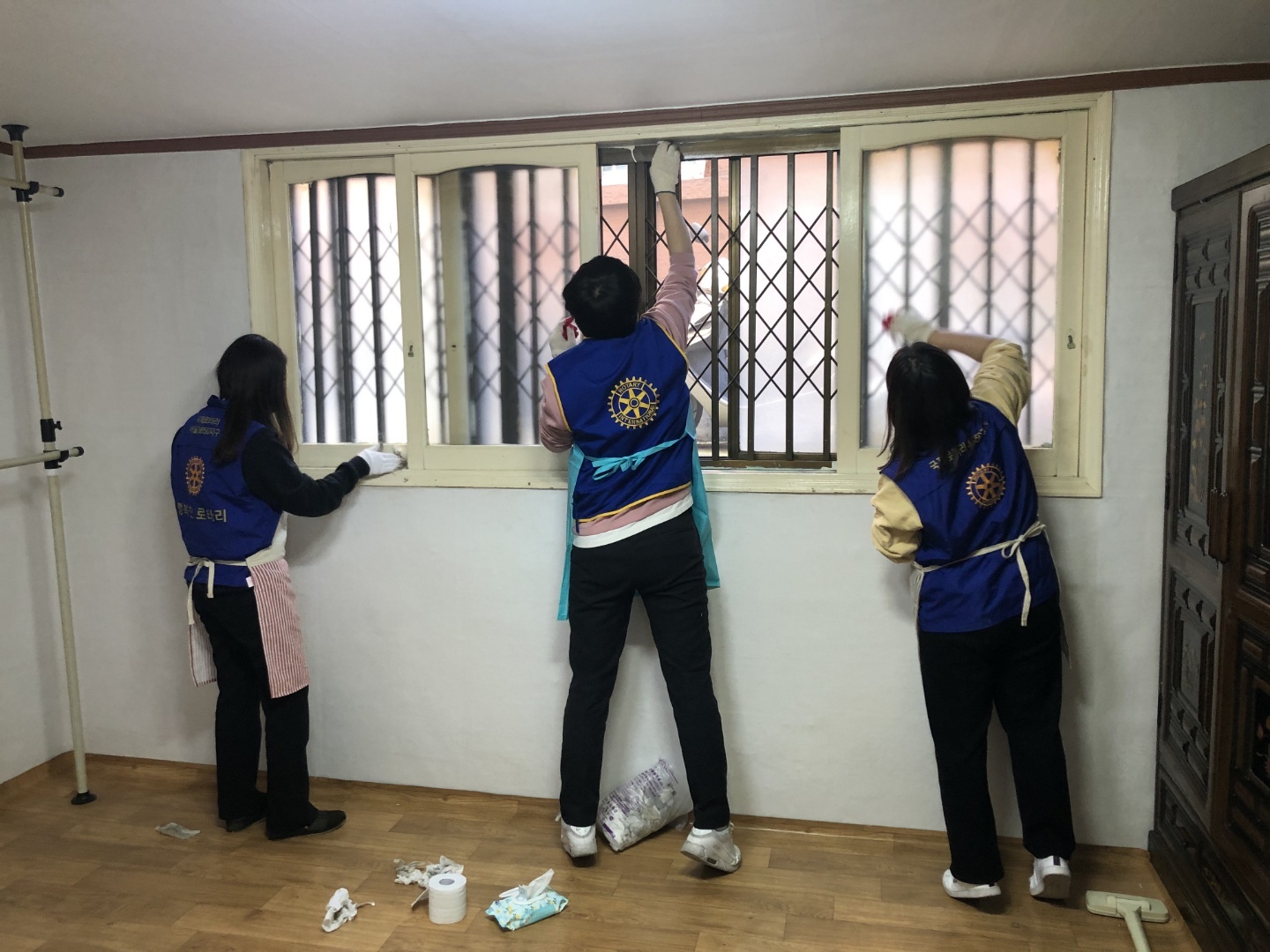 할머니 할아버지들은 혼자 계시다 갑자기 많은 사람들이 몰려와 좁은 방과 온 집에 가득 있어서 좋기도 하지만 내 살림을 많은 사람이 만지고 여기저기 옮기니 때론 불안해하시기 때문에 안심시켜드리며 일하는 것도 필요하다. 온갖 살림이 어지러 지고 도배하느라 복잡한 가운데도 틈새를 내어 할머니, 할아버지와 대화를 하면 대부분 가정에 어려운 일들도 많이 겪으셨고 현재도 치매로 인해 자기표현을 잘 못하시기도 한다. 그렇지만 하나하나 깨끗해지는 집을 보시면서 이렇게 아무조건 없이 오직 나만을 위해 봉사해주는 어린학생들과 로타리안들에게 감동하셔서 감사하고 고맙다는 말씀을 수없이 하신다. 첫날 아침부터 서창우신세대위원장께서 남산클럽 김상은 신입회원과 함께 오시고, 김희태 6지역대표님과 송귀영 기획위원장께서 함께하여서 더욱 더 활력이 넘쳤다.
