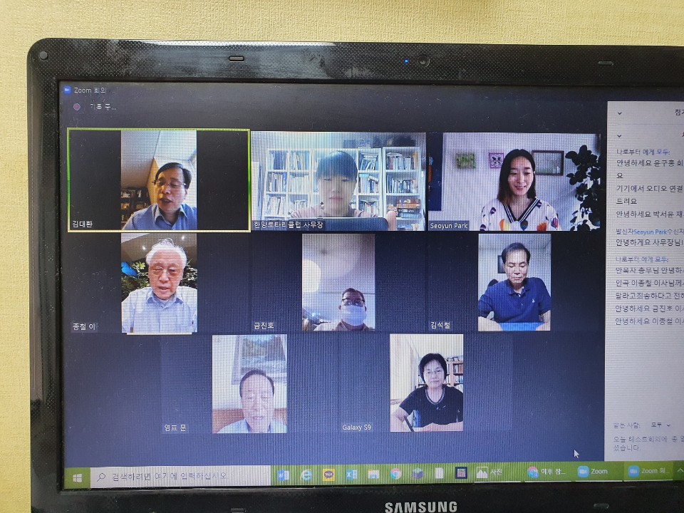 이에 한양로타리클럽 회장 및 임원진들은 줌(zoom)을 통한 온라인 이사회를 지난 9월 1일 화요일에 개최, 10명의 임원진들이 참석하여 여러 가지 안건을 심의 및 결의하였으며, 이어서 9월 14일 월요일에는 한양로타리클럽 최초로 온라인 화상 주회를 개최하게 되었다.