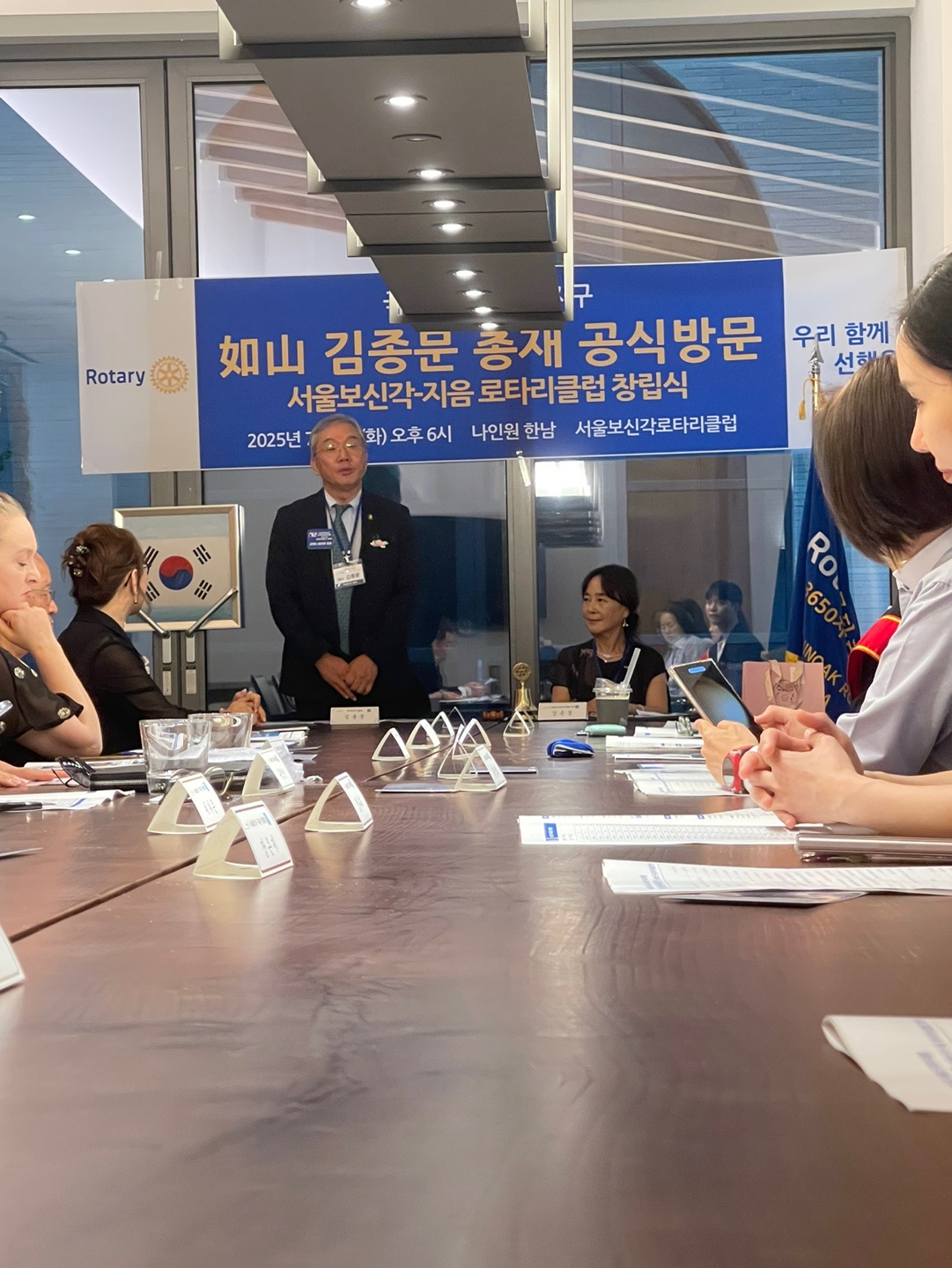 국제로타리 3650지구(총재: 김종문)는 7월 8일(화), 2025-26년도 회기 클럽 총재방문 일정의 일환으로 서울보신각로타리클럽(회장: 강은경)을 방문했다.